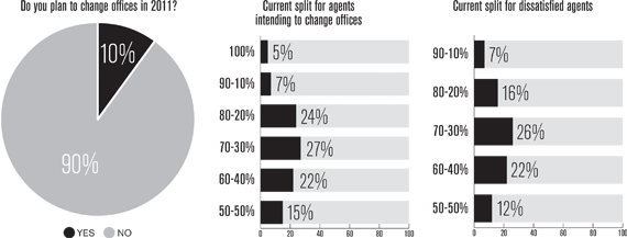 Though there is dissatisfaction with splits, dissatisfaction with offices is down; 10 percent of agents plan to change offices, as opposed to 20 percent in 2009. However, 27 percent of dissatisfied agents plan to change brokerages, up from 20 percent from 2009. It appears that in 2009, agents who intended to change offices weren’t necessarily dissatisfied, but looking for alternatives and new opportunities given the market turmoil. The results from 2010 shows agents who are looking to move are agents who are dissatisfied.