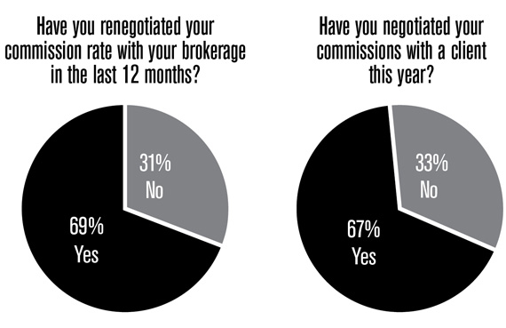 After seeing an increase in agents moving to 100 percent commission deals in 2010, last year, we saw a shift away from these transaction/desk fee deals towards the more traditional brokerage splits. In 2011, 16 percent of agents had 100 percent commission deals, down from 2010’s 22.6 percent, while in 2011, traditional splits were up to 34.4 percent from 22.8 percent. In addition, the trend of whether agents would negotiate client commissions increased slightly in 2011, from 60 percent who would negotiate in 2010 to 67 percent last year. About 80 percent of agents were willing to negotiation commissions in 2009.