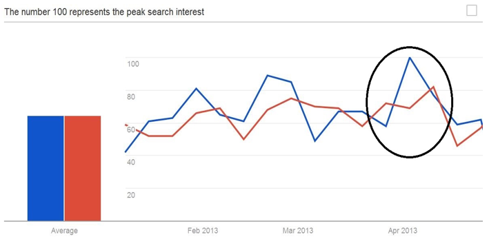 The average search interest appears to consistent from last year, but if you total the interest from January through April 2013 vs. January through April 2012, you’ll see that 2013’s interest is higher than last year, 1086 vs. 1014.