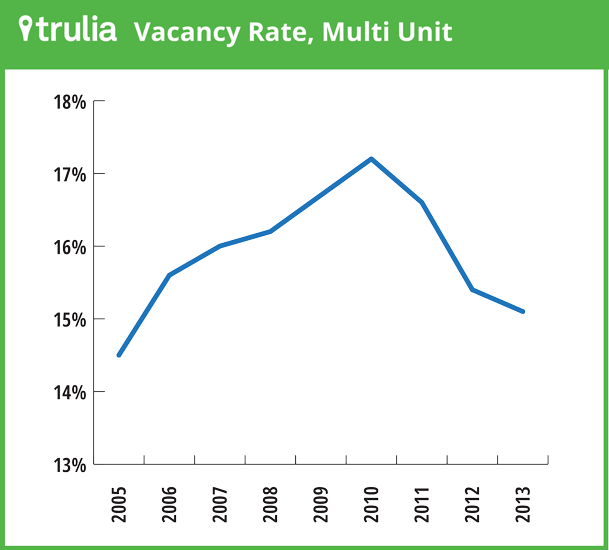 •Second, the housing vacancy rates tell a radically different story about the housing market than what we’re used to through the guise of NAR’s housing inventory numbers. First, here’s a graph from Trulia showing the vacancy rate for multifamily residences, which peaked at 17.2 percent in 2010 and has fallen steadily since then, with the demand for rentals being so strong: