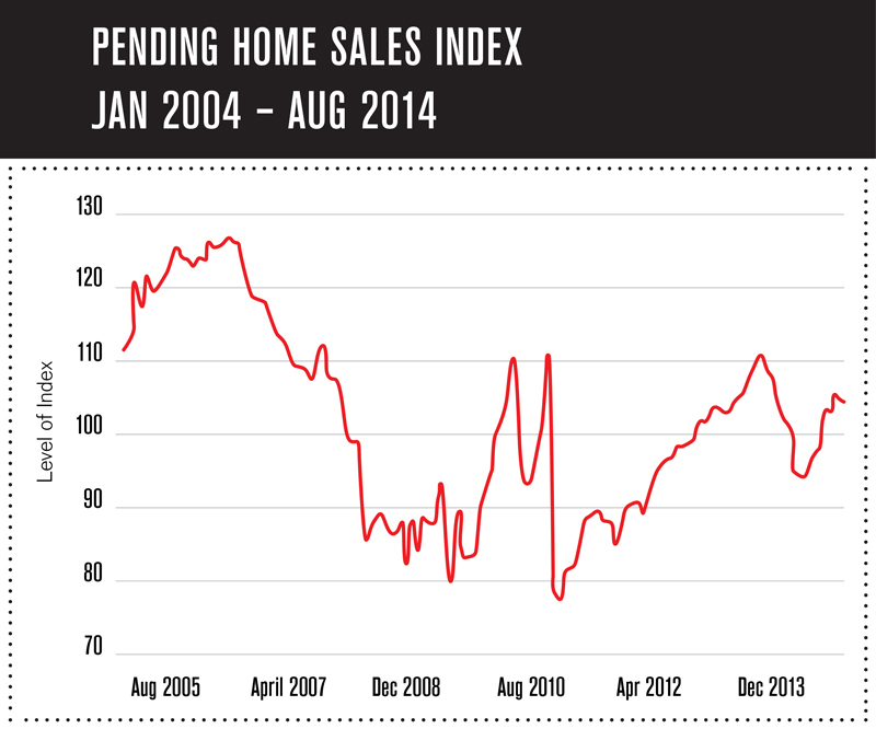 Interested in how the Pending Home Sales Index has charted the last 10 years? Check out our graph below, which follows the index from 2004 through August of this year. Two things to note: the strange jump in 2009 and 2010 was due to the homebuyer tax credit; and the steep drop in 2013 was due to the rising mortgage rates of that year.