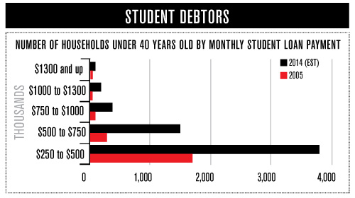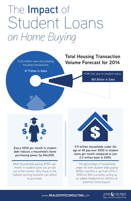 Analysts have debated just how detrimental student debt is to the economy, and a new study by John Burns Real Estate Consulting, as reported in The Wall Street Journal, has come to some stark conclusions – in 2014 alone, there will be 414,000 transactions lost to student debt, meaning that the burden of student loans will stop the transactions from taking place; assuming a typical home price of $200,000, that translates to $83 billion in lost volume.