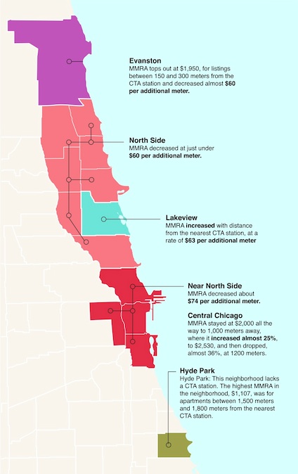 In a city-wide examination of the relationship between median monthly rent price asked (MMRA) and proximity to a CTA station for selected neighborhoods in the Chicago metro area, RentHop found that at both the city-wide and neighborhood level MMRA fell as distance from the nearest CTA station increased. RentHop looked at the median price for apartments within a 300-meter radius from the nearest CTA station, 300 and 600 meters from the nearest CTA station, etc. without regard to whether the closest CTA station was in the same neighborhood as the listing.