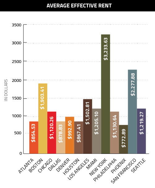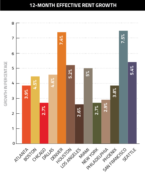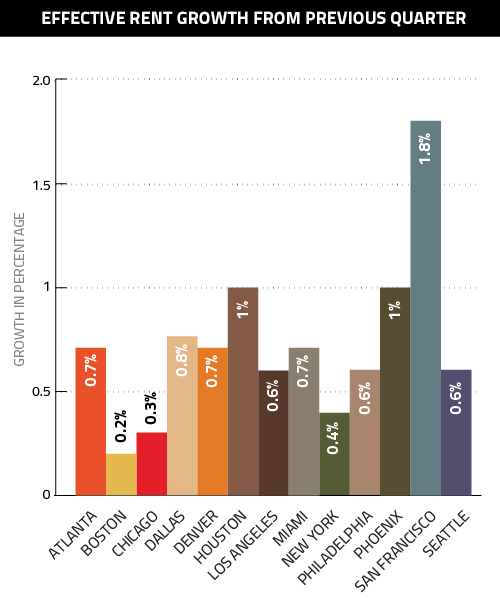 It’s very interesting, what’s happened so far this year. While markets such as Houston and San Francisco have seen their rents rise 1 and 1.8 percent, respectively, Chicagoland’s increased by a minuscule 0.3 percent, among the lowest of the metro areas we sampled.