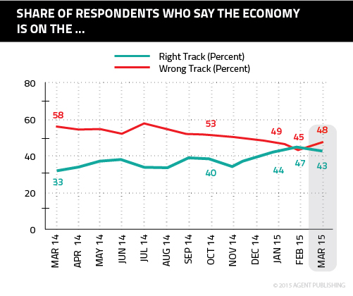 3. The share of respondents who say the economy is on the right track decreased by 4 percentage points to 43 percent, while those who say the economy is on the wrong track rose by 3 percentage points to 48 percent; notice how, after crossing paths briefly in February, the more consumers once again view the economy negatively.