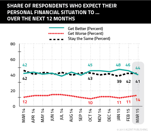 4. The percentage of respondents who expect their personal financial situation to get better over the next 12 months fell to 41 percent; as with our previous graph, we again see that optimism has fallen in favor.