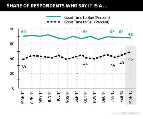 1. Consumers who say it is a good time to buy a house fell slightly, while those who say it is a good time to sell rose to 46 percent, which is a new survey high; many agents have told us that we’re now in a seller’s market, and consumers now seem privy to that knowledge.