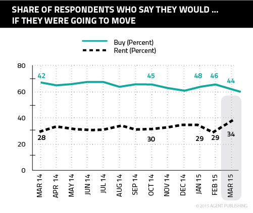2. The share of consumers who say they would buy if they were going to move fell 5 percentage points to 60 percent – that’s a new survey low, and the share who would rent rose to 34 percent; perhaps the soaring home prices of the last two years are impacting how consumers view housing?