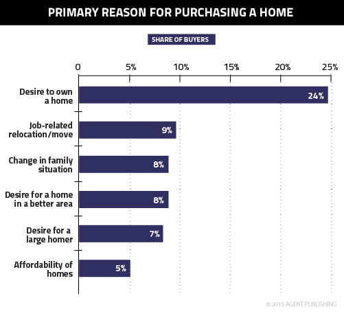 Three things immediately jump out in that graph: the overwhelming desire among consumers to simply own a home; the No. 2 and 3 reasons (relocation and family situation) being more of necessity than desire; and the affordability of homes ranking so low.