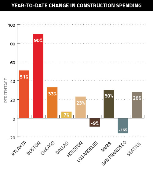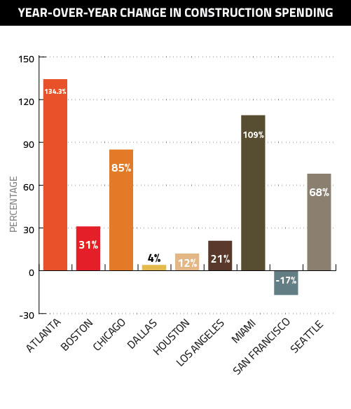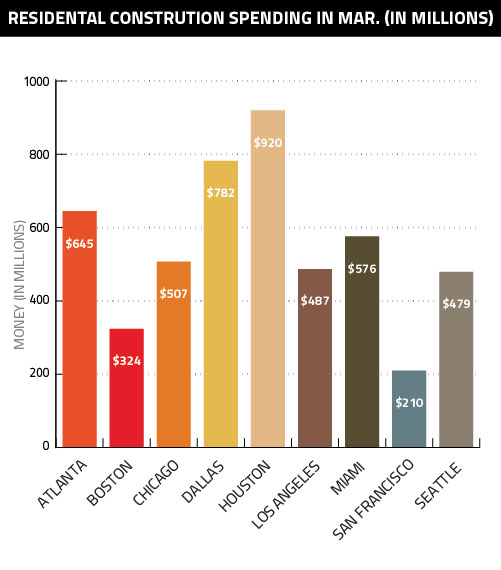 According to the latest analysis from Dodge Data & Analytics (DDA), residential construction spending in Chicagoland totaled roughly $507 million in March, which has vaulted the metro area ahead of previous construction meccas Los Angeles and Seattle. See our graph below for more perspective: