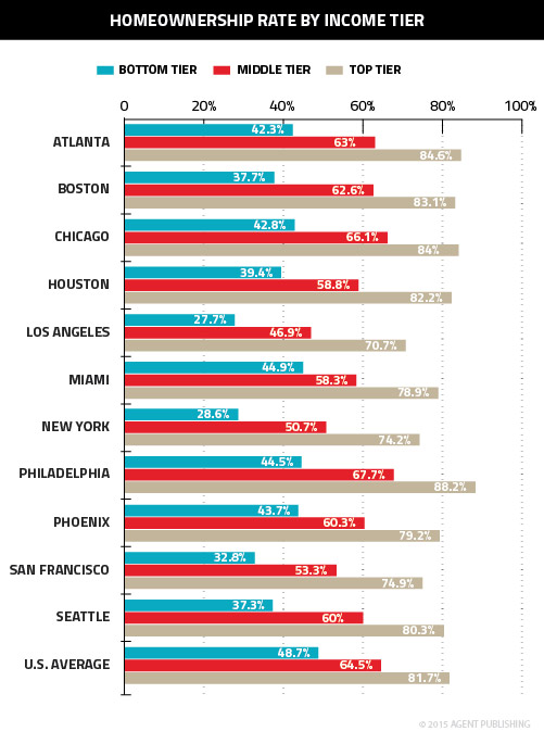 As you can see, in nearly every metro area (including here in Chicagoland), the homeownership rate for upper-tier income earners is nearly double that of working class individuals.