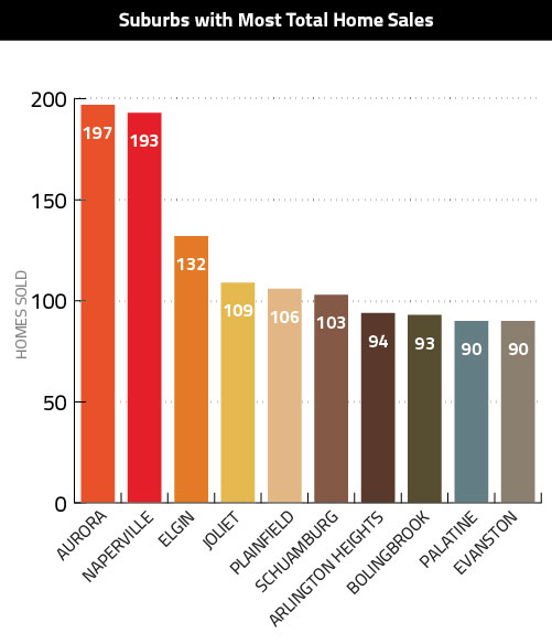 Aurora and Naperville are the usual suspects at the top, though sales in those two suburbs did increase 15.2 and 14.9 percent, respectively, from March to April.