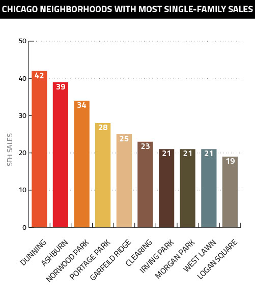 Ashburn, which has long been the top-selling single-family neighborhood in Chicago, slipped to the No. 2 spot in April, as Dunning’s eye-opening 61.5-percent rise in sales vaulted it to the top position (sales were still up 25.8 percent in Ashburn).