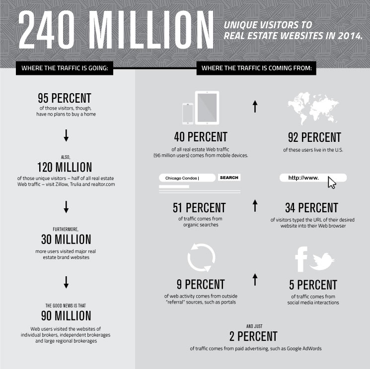 There were 240 million unique visitors to real estate websites in 2014, but where did they go? And where is that traffic coming from? Find out in our infographic below with statistics from a RealTrends study on the market’s interaction with real estate websites in 2014 (click the image for full size):
