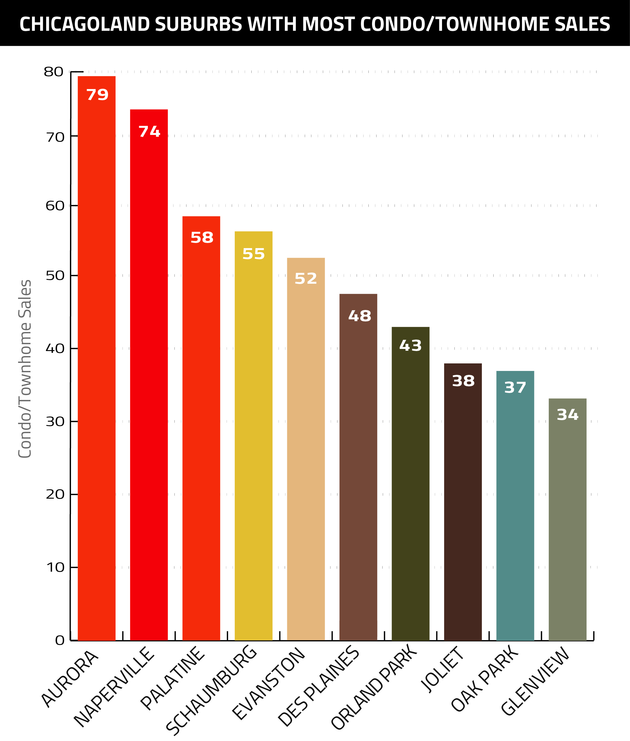 From April, condo/townhome sales were up 51.9 percent in Aurora, 48 percent in Naperville and 37.1 percent in Des Plaines.