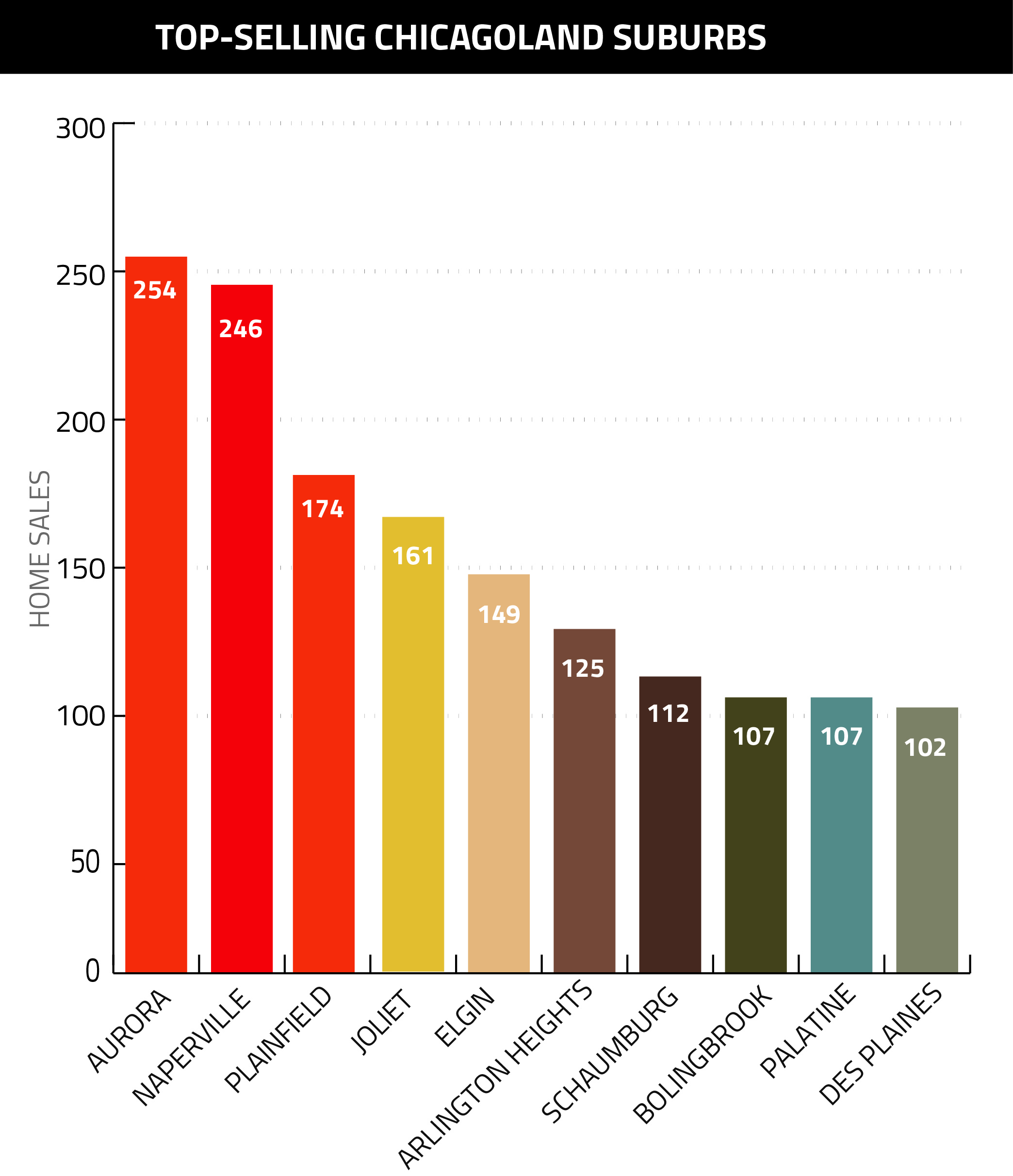 The most dramatic increase, though, occurred in Plainfield, where sales jumped 64.1 percent and vaulted the suburb into the No. 3 slot. Also of note were Joliet, where sales rose 47.7 percent, and Arlington Heights, where sales rose 33 percent.