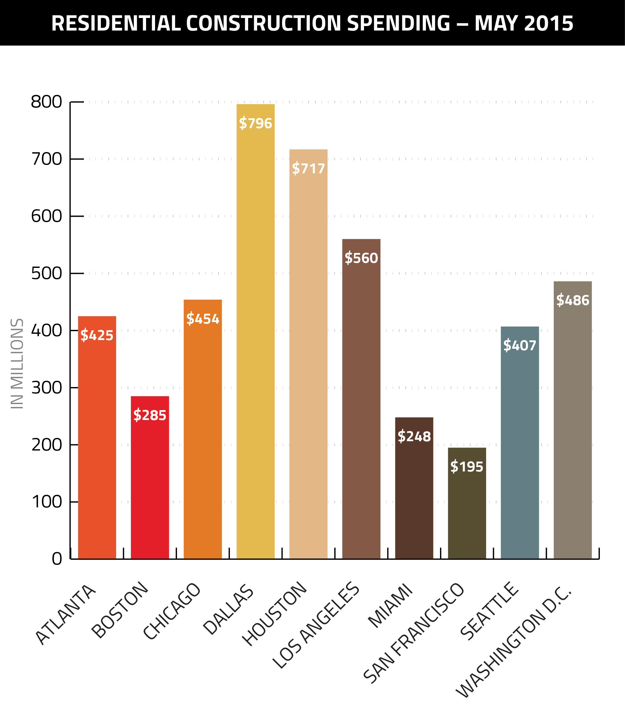 Residential construction spending in the Chicagoland area was up 74 percent year-over-year in May, and so far in 2015 is 38 percent ahead of where it was last year.
