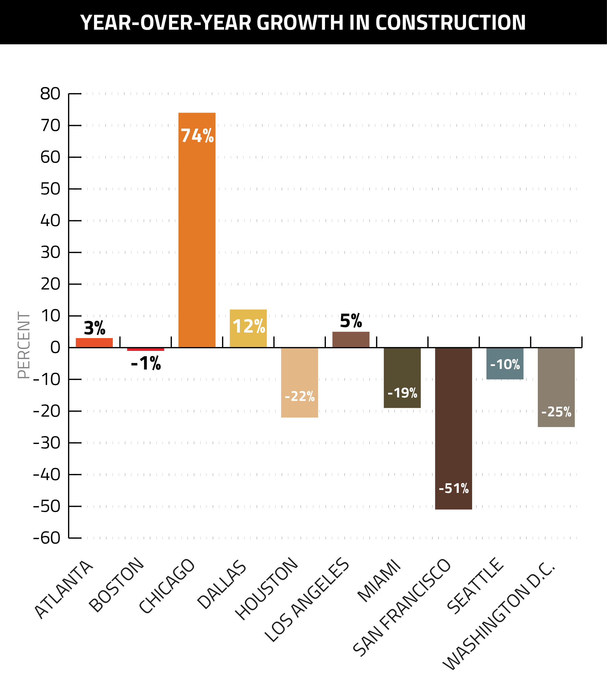 Although year-over-year construction statistics can be volatile (the previous yearly growth for Chicagoland, for instance, was 17 percent), the 74 percent jump in new construction activity was far ahead of the other metro areas we sampled.