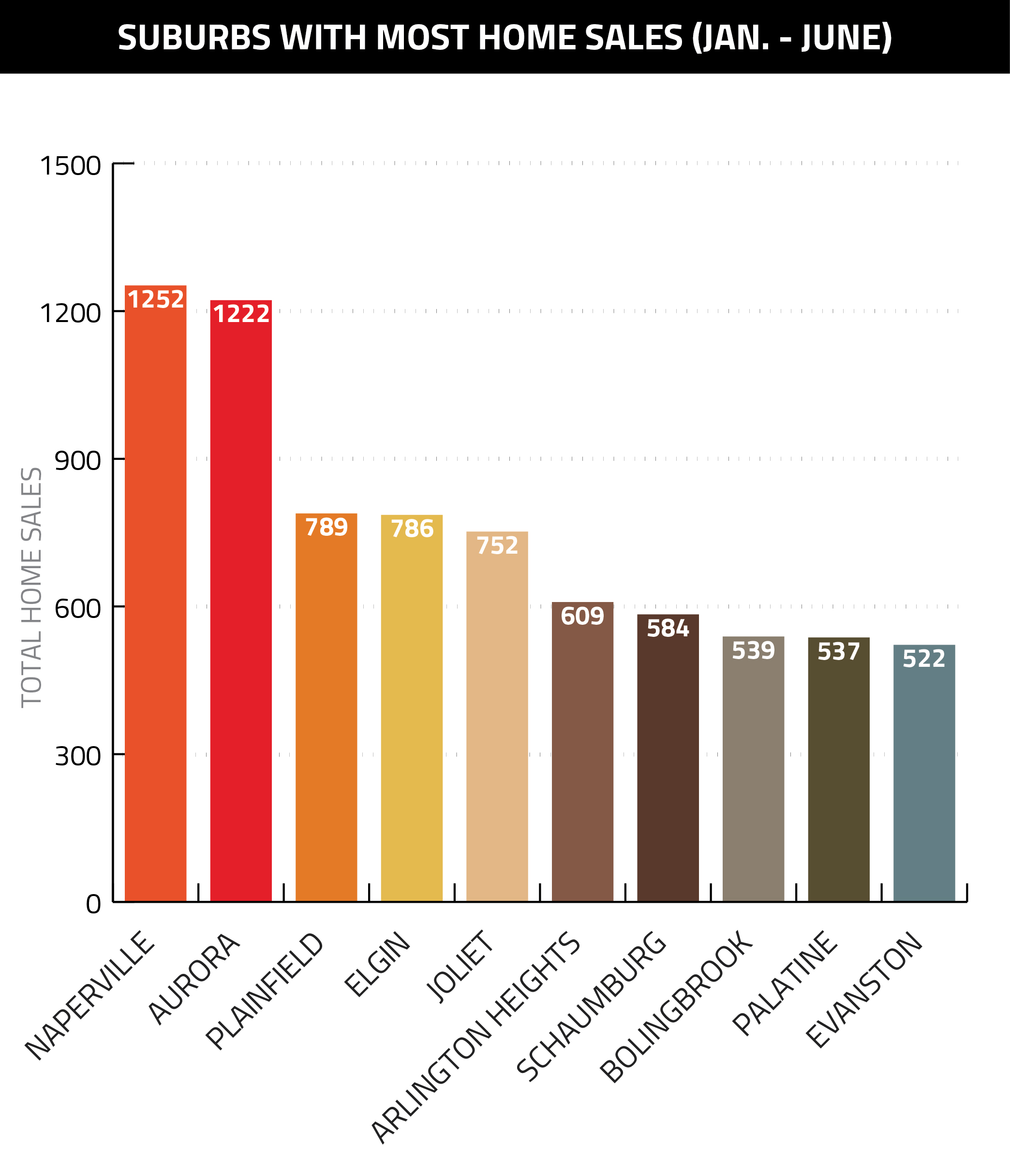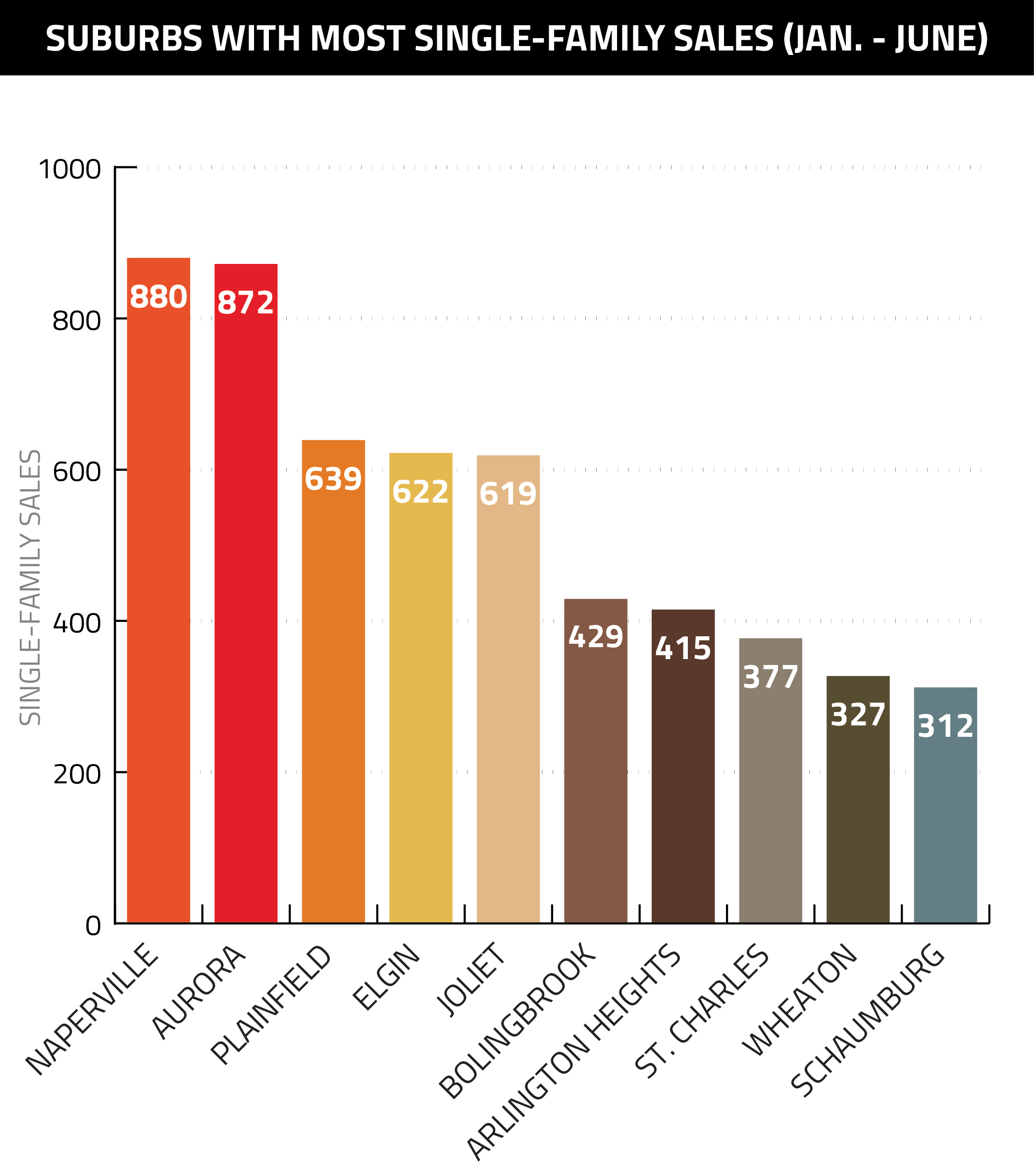 Redfin also provided data on the suburbs with the most single-family home sales, though given the prominence of single-family homes in Chicagoland’s suburbs, the resulting graph closely mirrors the previous graph: