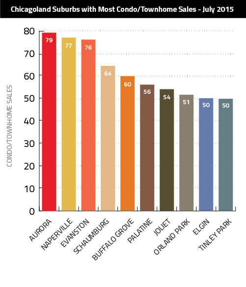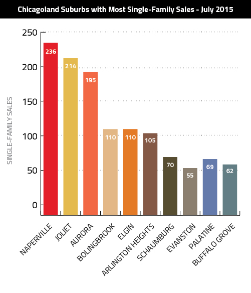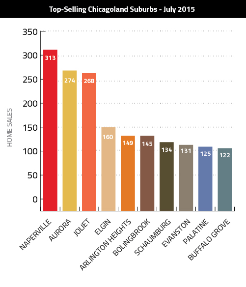 Naperville and Aurora are common fixtures in the No. 1 and 2 positions, but surprisingly, sales for both suburbs were down from June to July. In Naperville, sales were down 4.8 percent, while in Aurora, sales dropped 3.2 percent.
