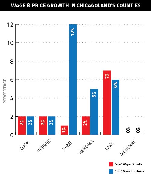Although prices in Kendall and especially Kane County rose beyond wages, the two metrics kept equal pace in Cook, DuPage and McHenry, while wages outpaced prices in Lake County; given that 6.1 million people, or nearly half of Illinois’ entire population, live in Cook and DuPage, the trends in those two counties are especially encouraging.