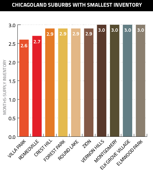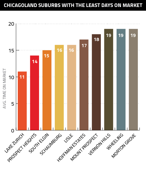 At 11 days, Lake Zurich had the speediest market in suburban Chicago, though all the other suburbs in the graph did see their homes sell in less than three weeks; for comparison’s sake, the average across all Chicagoland is 53 days.