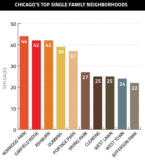 The single-family market was relatively stable, though only Garfield Ridge and Dunning – where sales shot up 55.6 and 21.9 percent, respectively, from August – posted strong gains. The other neighborhoods, such as first-place Norwood Park and third-place Ashburn, were flat month-over-month, though sales did drop 11.9 percent in Portage Park.