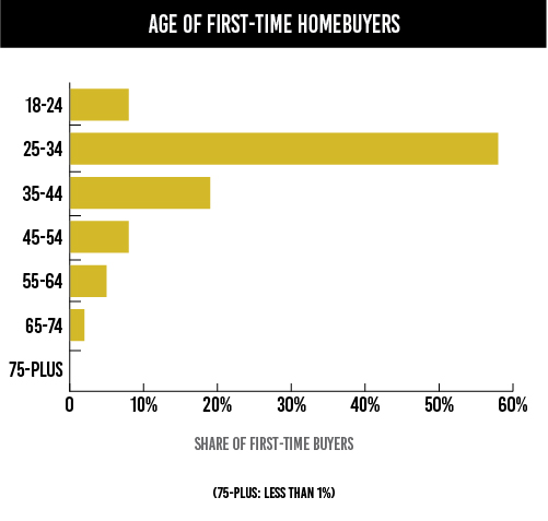 4. The Demographics of First-Time Buyers – Unsurprisingly, Millennials and Gen Xers comprise the lion’s share of first-time purchases, with 58 percent aged 25 to 34 and 19 percent aged 35 to 44. First-time buyers are also a relatively diverse bunch, at least compared with repeat buyers, who are 88 percent white, 5 percent Hispanic and only 3 percent black; first-time buyers, meanwhile, are 78 percent white, 9 percent Hispanic and 7 percent black.
