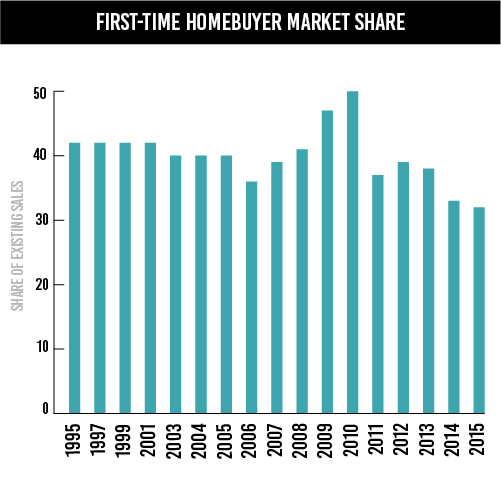First-time homebuyer share has dropped to its lowest level in 27 years, with just 32 percent of all existing-home sales going to first-time buyers in 2015.