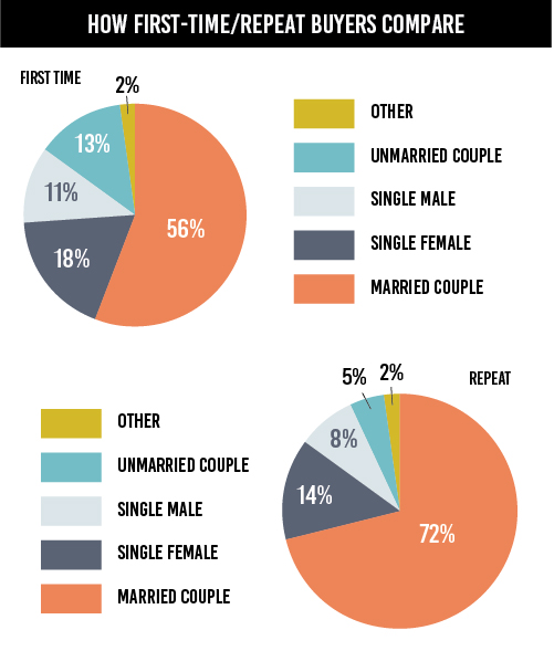 3. Intriguing Household Types – The household composition for first-time buyers differs substantially from repeat buyers. While married couples comprise 56 percent of first-time buyers, they make up 72 percent of repeat buyers, while unmarried couples, at 13 percent of first timers, are a far higher share than the 5 percent of repeat buyers. Also intriguing was the divide between single female buyers and single male buyers – among first-time buyers, single females had a 7 percentage point advantage (18 percent to single males’ 11 percent), and for repeat buyers, the advantage was 6 percentage points (14 percent to 8).
