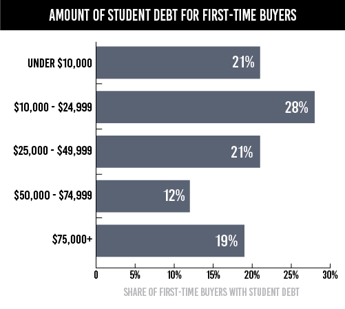 6. Student Loan Demons – Student loan debt has become one of the main specters haunting for housing today, and NAR’s report did little to assuage those fears. Forty-one percent of first-time buyers reported have student debt, and among those individuals, 31 percent had debts of $50,000 or more. Furthermore, 58 percent of first-time buyers reported that student loans delayed their home purchase, and 22 percent stated that debt of some kind delayed their home purchase for more than five years.