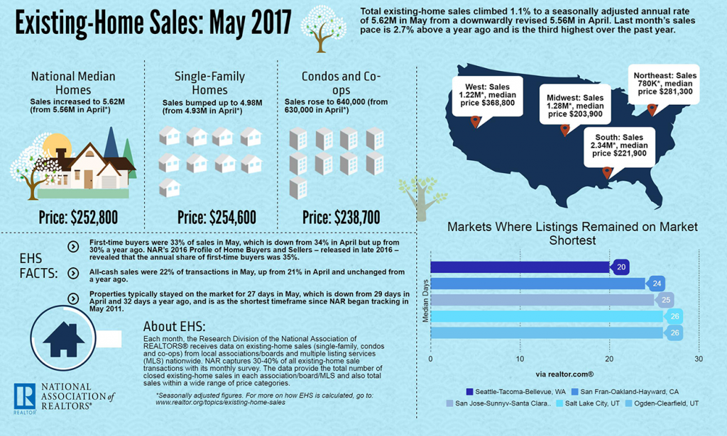 Total existing home sales increased 1.1 percent from April to a seasonally adjusted annual rate of 5.62 million in May. This includes single-family homes, townhomes, condominiums and co-op sales. This is 2.7 percent higher than May 2016’s sales figures and the third highest in the past year.