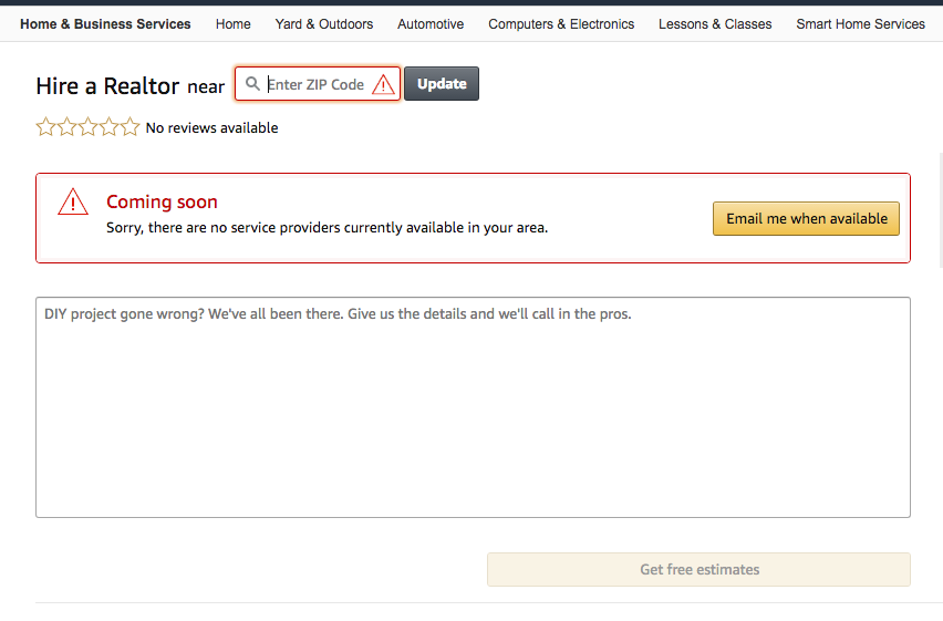 Amazon quietly added, and then quietly removed, a page to its website titled Hire a Realtor. According to GeekWire, the website included an option to search for a Realtor by ZIP code with a “Coming Soon” and “Email me when available” prompt.