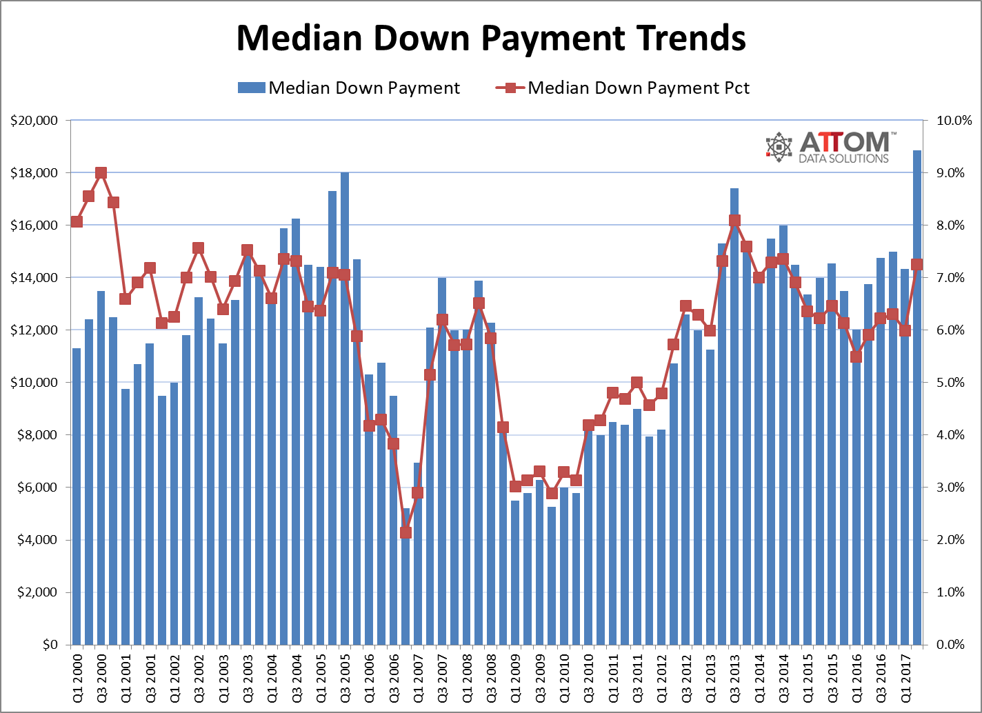 ATTOM Data Solutions recently released its Q2 2017 Residential Property Loan Origination Report, which found that homes purchased with loans in Q2 2017 saw median down payments of $18,850, which was 7.3 percent of the median price of the homes purchased. This is up 6 percent from the previous quarter and 5.9 percent from Q2 of last year.