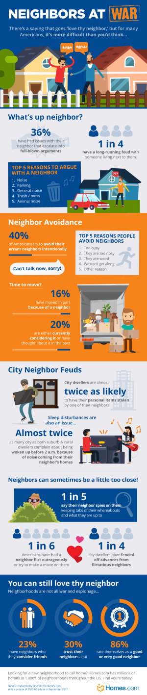 The Homes.com survey also reveals that 36 percent of Americans have had issues with a neighbor that escalated into an all-out argument. This may be one of the reasons that 40 percent said they intentionally try to ignore their neighbors.