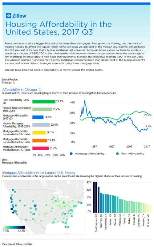 Low mortgage interest rates, which keep monthly payments down despite rising housing costs, mean homeowners are spending less of their income on house payments today than they did from 1985 to 2000. In Q3 2017, homeowners in Chicago spent 14.4 percent of their income on mortgage payments, compared to an average of 22.8 percent between 1985 and 2000. Mortgage affordability reached its peak in Chicago in September 1981 at 42.4 percent.