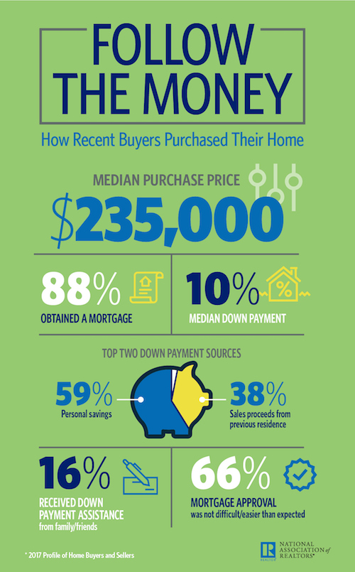 According to the National Association of Realtors’ 2017 Profile of Home Buyers and Sellers, the typical down payment for first-time homebuyers fell from 6 percent in 2016 to 5 percent in 2017, which matches the lowest amount since 2013. However, the median down payment offered by all homebuyers was 10 percent.