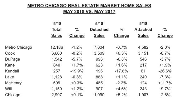 - Total home sales in the seven-county region studied totaled in at 12,186, down just 1.2 percent from May 2017. Home sales rose in just three counties: Kane, McHenry and Will, with Kane seeing the greatest gain at 1.7 percent. In the other four Chicagoland counties, sales were down. The most significant drop was in Kendall at nearly 20 percent.