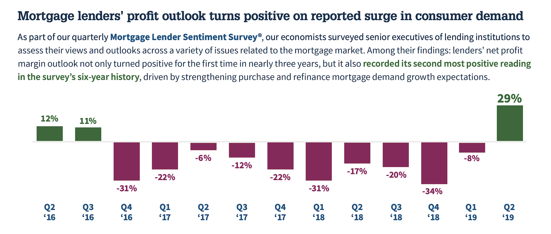 The government-backed mortgage firm reported that responses to its latest quarterly Mortgage Lender Sentiment Survey were overwhelmingly positive for the second quarter of 2019 — 29 percent of respondents said their firm’s net profit outlook was in the black. This is the first quarter since Q3 2016 that more respondents saw a positive rather than negative outlook for profitability, and is the second-highest margin of optimism recorded in the survey’s six-year history.