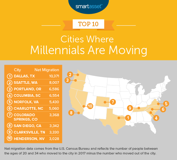 As millennials comprise more and more of the housing market, some are relocating in search of better jobs, quality of life, and housing costs. SmartAsset took a look at where millennials are moving to find these things with Census Bureau data from 173 cities.