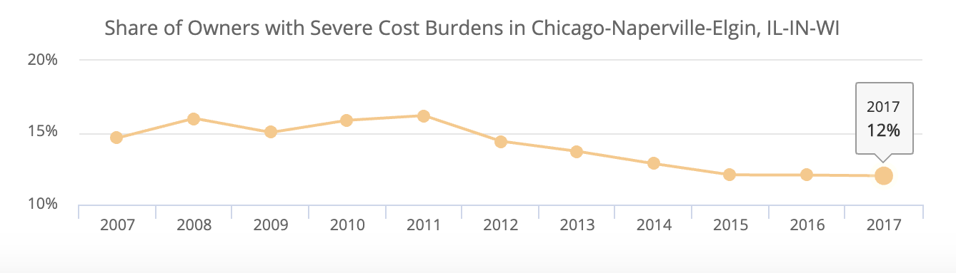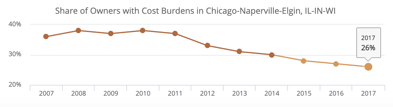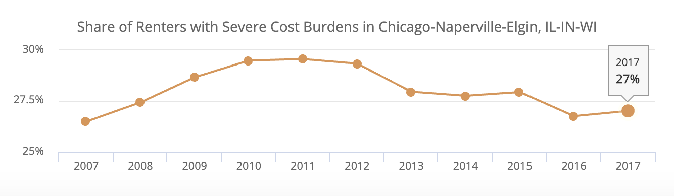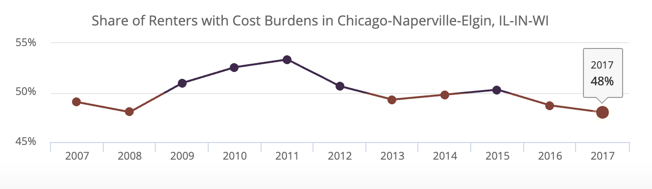 And overall, residential cost burden for Chicagoans has been steadily decreasing since the depths of the recession. While 34 percent of all households were cost burdened in the most recent data from 2017, that’s down significantly from the 43 percent level in 2010.