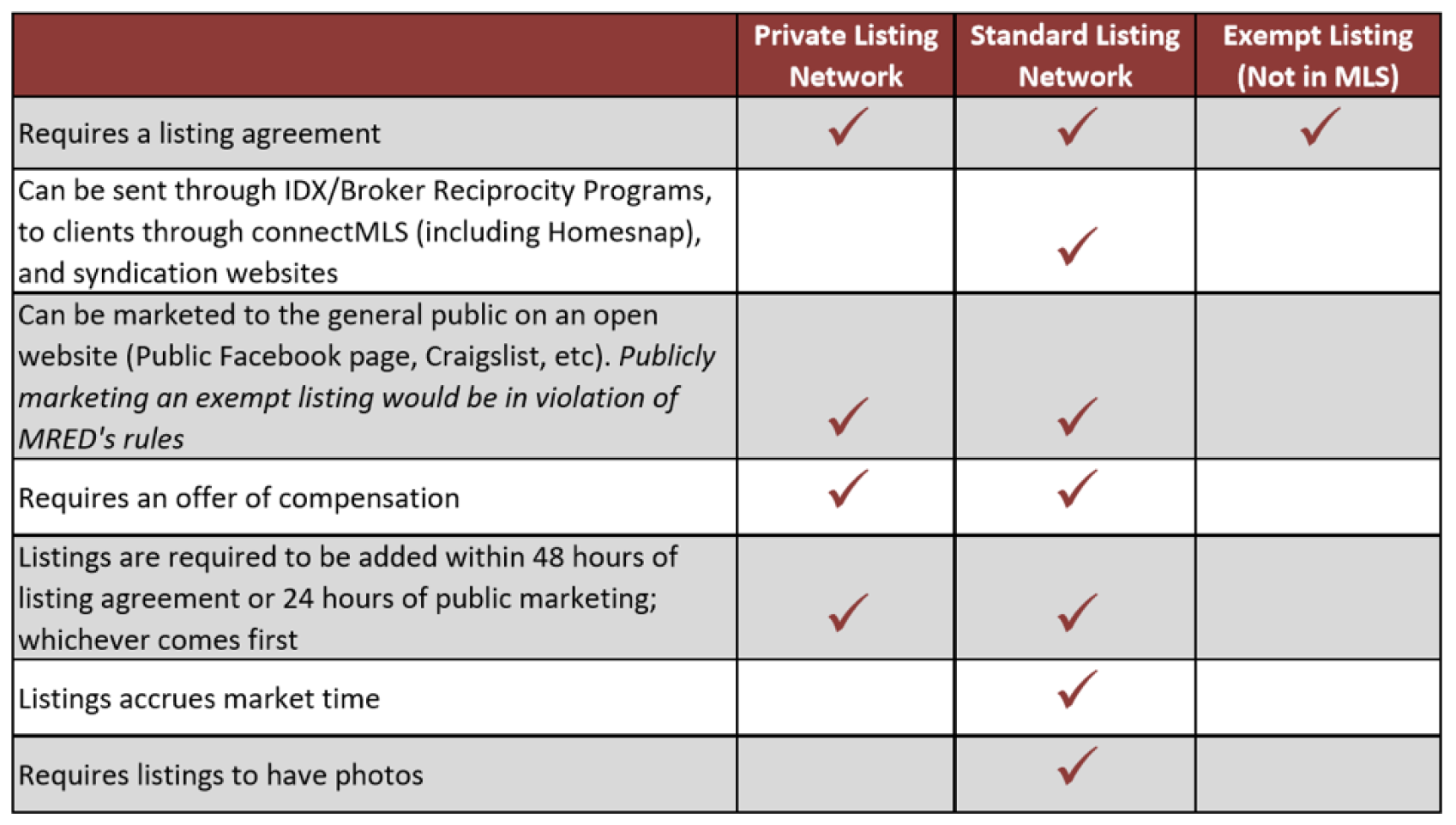 MRED’s white paper outlines the approach they’ve taken to off-MLS listing since 2016. The MLS’s Private Listing Network is a repository within connectMLS for premarket, “coming soon” and any other listings that might otherwise be kept off the MLS. The idea is “that agents do not feel the need to go around the MLS to promote certain types of properties that are not appropriate to be featured as a standard MLS listing,” according to the white paper.