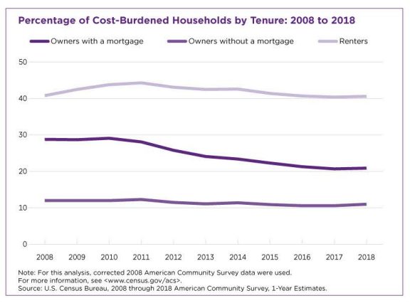 According to the Census data from 2018, 11 percent of homeowners without a mortgage payment found themselves to be paying 35 percent or more of their monthly household income on housing costs such as utility bills, real estate taxes, property insurance, and other home fees. Still, this has eased too since the recession; in 2008 this number was slightly higher, at 12 percent.