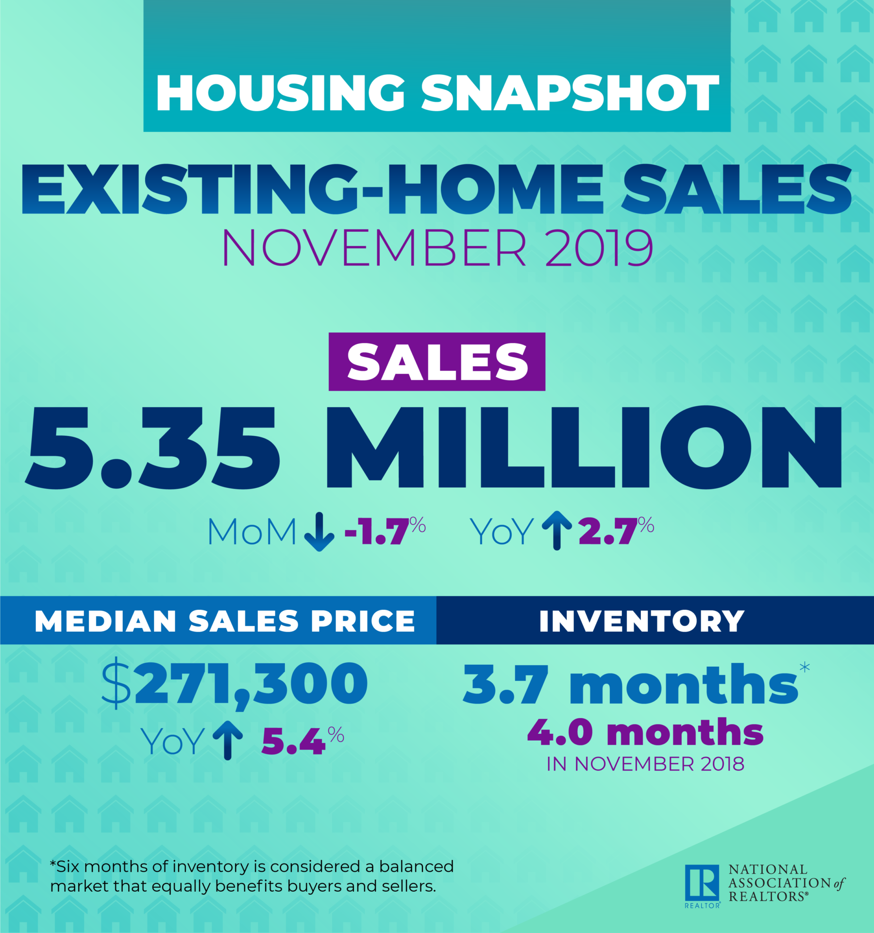 Existing-home sales dropped 1.7 percent in November from the previous month to a seasonally adjusted rate of 5.35 million. Sales were up from November 2018, though, by 2.7 percent.