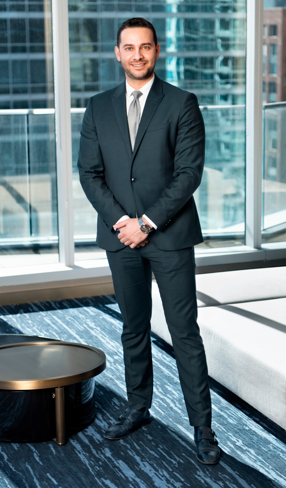 Suit: custom-made by Giorgenti NYC; shirt and tie: Eton from Nordstrom; shoes: Christian Louboutin; belt: Salvatore Ferragamo