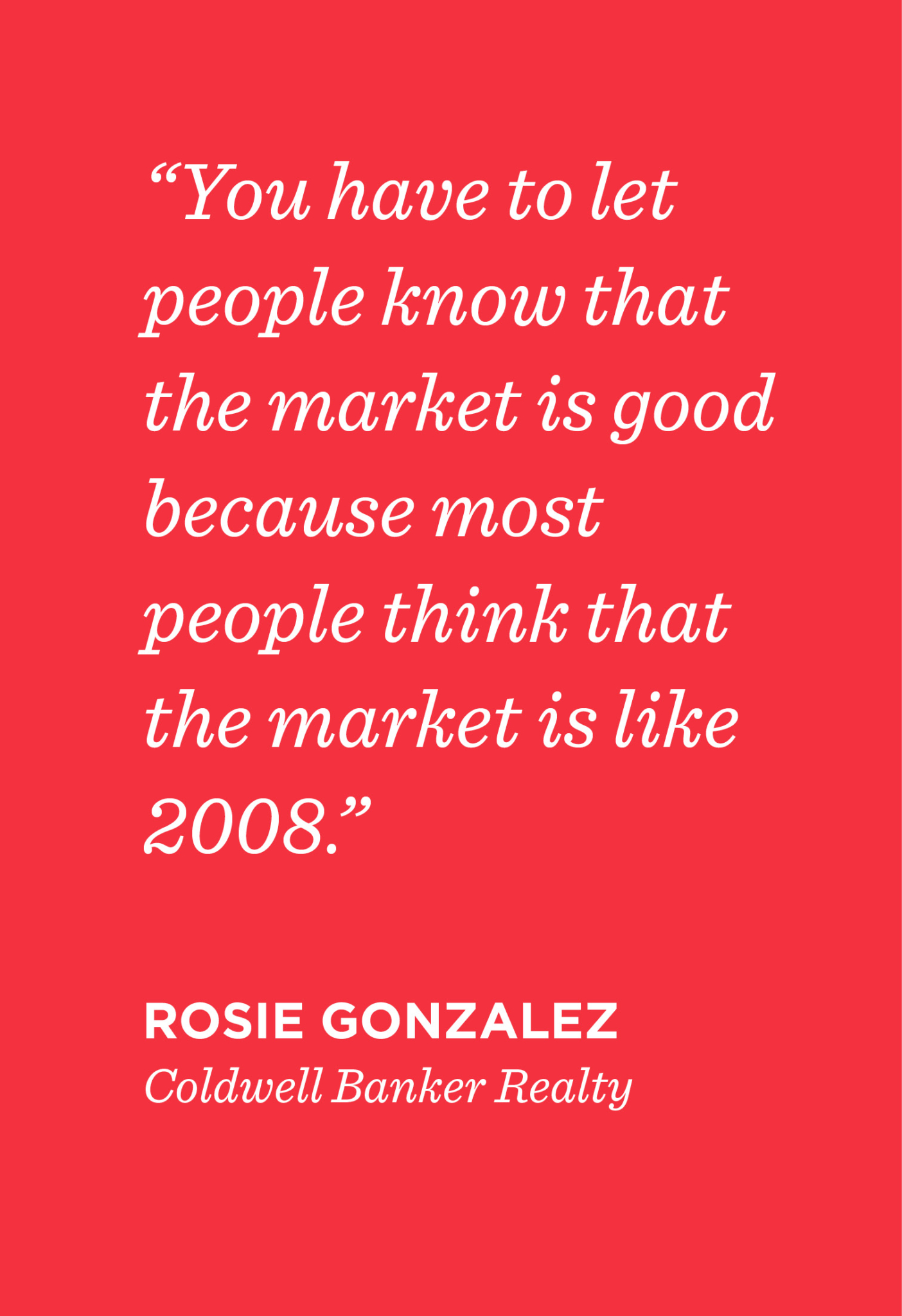 Sometimes an agent’s work can speak for itself. Gonzalez noted that with less available inventory, her clients’ properties were selling faster during the pandemic-related shutdown than they might in a normal market, which went right along with her narrative about the market. “We put a lot of houses on the market and they all sold right away, and so it kind of spreads,” she said. “When I put houses on the market in the pandemic and they sell even on the ‘coming soon’ [list], they tell the neighbors.”