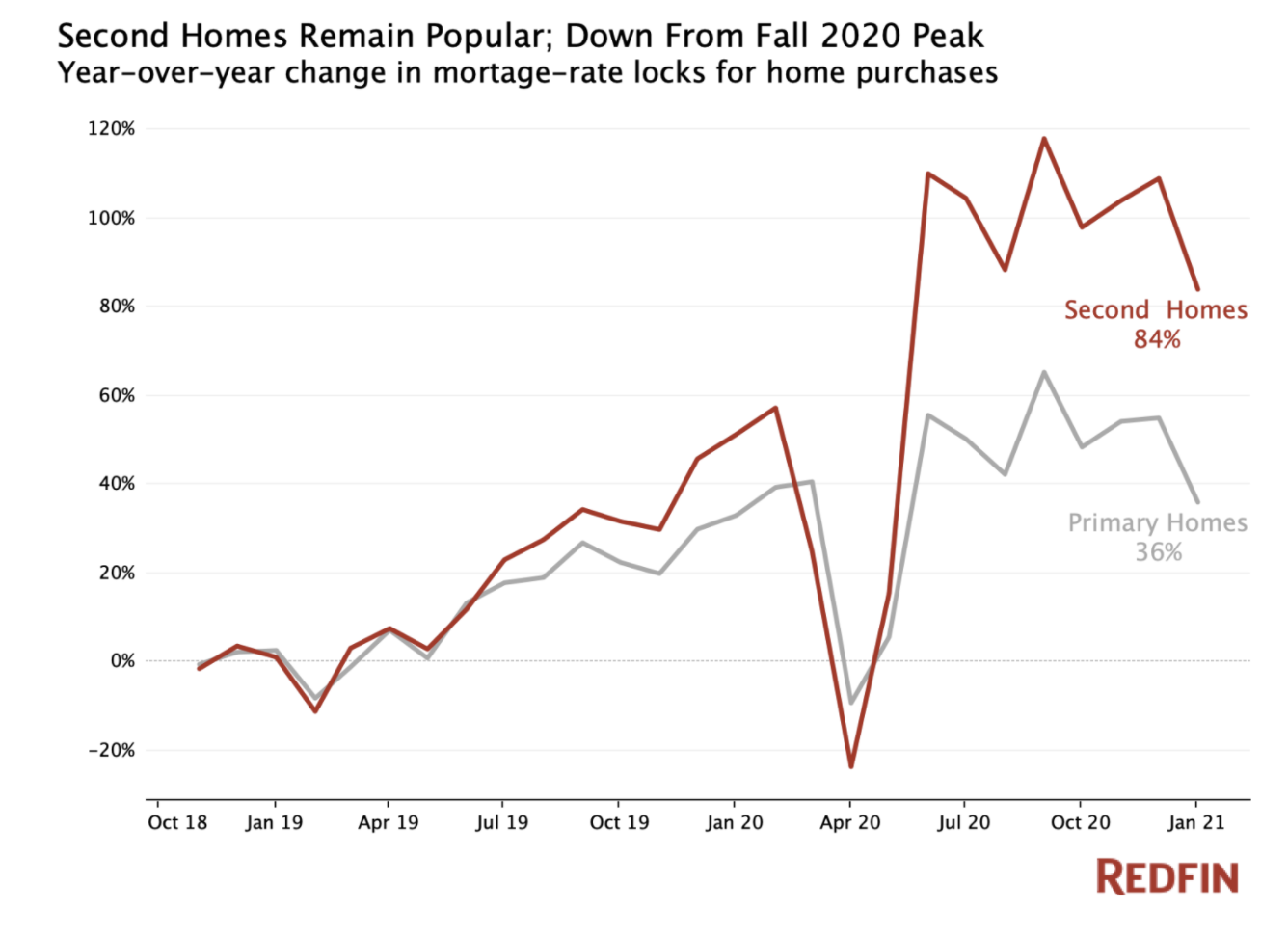 The analysis is based on Redfin’s review of mortgage-rate lock data provided by real estate analytics firm Optimal Blue. The report notes that white-collar workers working from home are purchasing vacation homes to escape densely packed cities. The trend of purchasing a second home has sent home prices in seasonal towns skyrocketing in value by 19% for the year ending December 2020.
