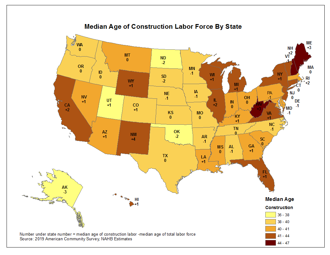 Maine has the oldest median age, at 47, followed by New Hampshire at 46 and West Virginia at 45. Construction workers are younger than average in the central U.S., with half of all workers in North Dakota and Alaska under 36 and half in Oklahoma and Utah under 38.