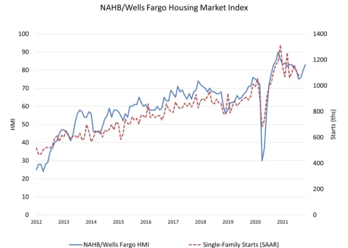 Builder confidence surged in November despite supply-side challenges, marking the third monthly increase in a row, the National Association of Home Builders reported, citing the latest NAHB/Wells Fargo Housing Market Index.