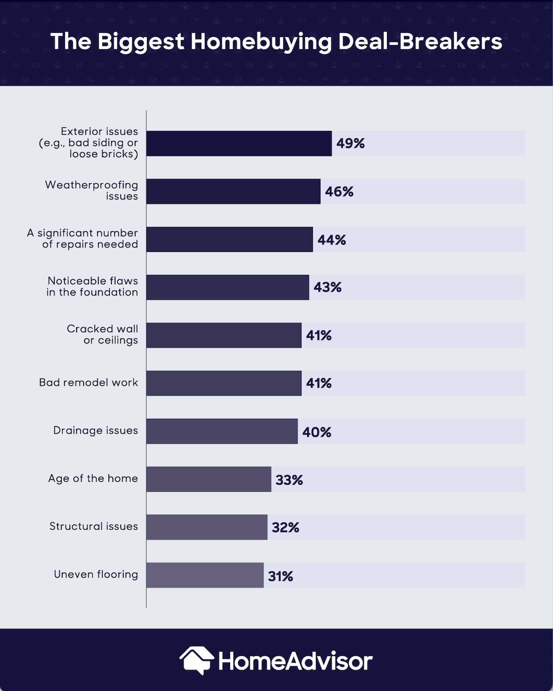 The main dealbreakers centered around exterior issues, closely followed by imperfect weather proofing and, more generally, a large apparent number of necessary repairs. Forty-nine percent of respondents rated problems on the exterior of the house, including bad siding or loose bricks, as a primary concern. Forty-six percent expressed concern over weatherproofing issues. Other problems which ranked highly on the homeowners’ lists were cracked walls or ceilings, bad remodeling and drainage issues.